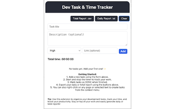Dev Task & Time Tracker هو إضافة مجانية لمتصفح Chrome مصممة خصيصًا للمطورين الذين يسعون لتعزيز إنتاجيتهم. تتيح هذه الأداة للمستخدمين تنظيم مهامهم اليومية بكفاءة مع توفير واجهة بسيطة لتتبع الوقت المستغرق في كل نشاط. من خلال التركيز على إدارة المهام وتتبع الوقت، تلبي احتياجات المطورين الفريدة الذين يهدفون إلى تحسين سير العمل الخاص بهم.